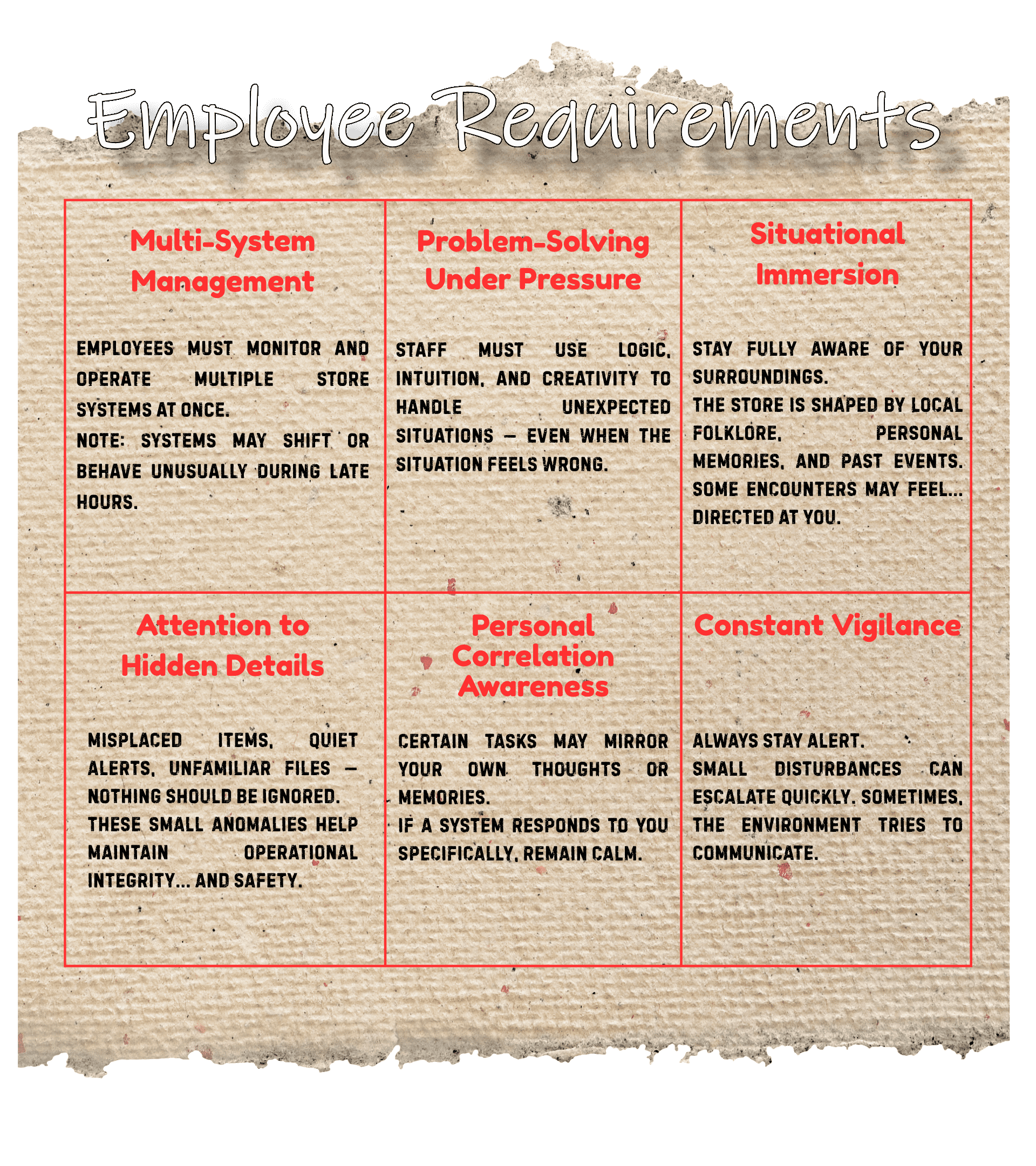 ![]() The store stands where an ancient tree once grew — a tree said to house an Entity that watched the land. Even though the tree is gone, its presence hasn’t faded. As you work through your shift, whispers trail through empty aisles, lights tremble without cause, and the CCTV catches shapes that don’t belong to this world. Every shift begins the same. Every shift ends differently. |